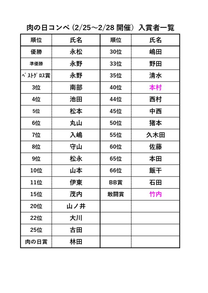 (※肉の日コンペの総合順位は、ゴルフ場に掲示しております。)