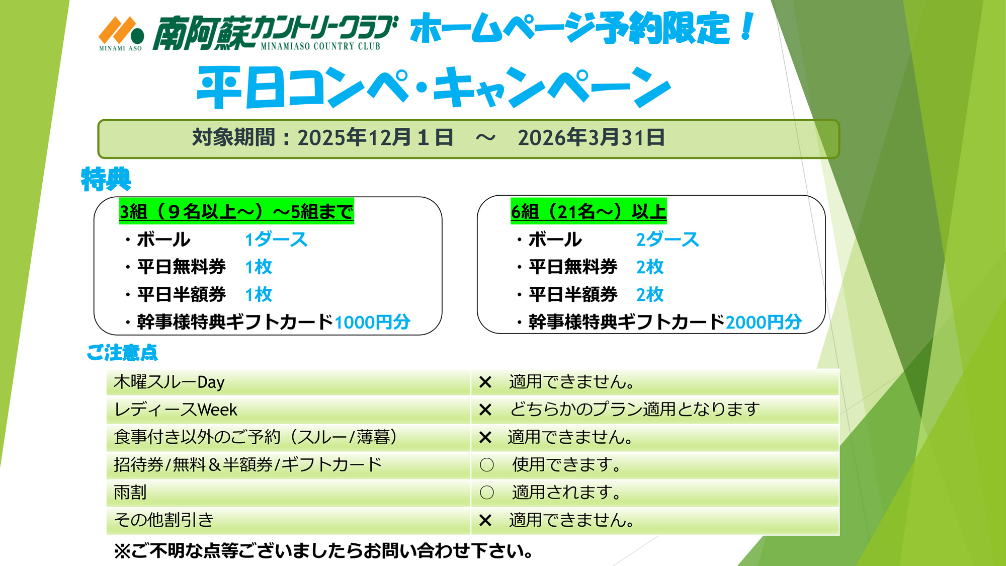 企業様、プライベートのコンペなど、”3組 12名以上”の場合はプレー料金より更に500円の割引をさせて頂きます。